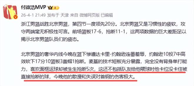 今晚,可以说是北京队耻辱之夜晚,不但大输浙江队15分,在拥有双塔三塔的情况下,篮板球被浙江队抢爆,前场篮板输了11个,抢断比浙江队少10个,可以说毫无活力和拼劲,北京媒体人宋翔怒喷:“输相”太难看。用主教练许利民的话说,那就是全方位出现了问题,是一场非常糟糕的比赛。