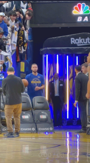 赛前,库里在热身最后站在球员通道前,向对面的篮筐单手扔出了一记纵贯全场的超远三分球,结果在众人的一片惊呼之中,篮球应声入网,库里也兴奋地直接跑回了更衣室。