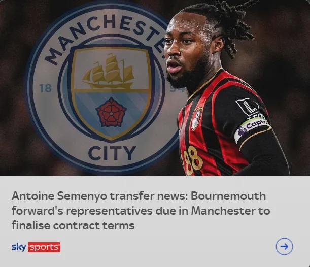 天空体育消息,曼城已经和伯恩茅斯就塞梅约6500万英镑违约金条款的细节展开了谈判,瓜迪奥拉的球队正寻求在转会窗开始时签下这名25岁的边锋。